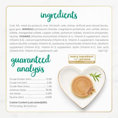 Cod, Fish, Meat By-products, Liver, Fish Broth, Sole, Shrimp, Artificial And Natural Flavors, Guar Gum, Minerals [Potassium Chloride, Magnesium Proteinate, Zinc Sulfate, Ferrous Sulfate, Manganese Sulfate, Copper Sulfate, Potassium Iodide], Tricalcium Phosphate, Taurine, Vitamins [Thiamine Mononitrate (Vitamin B-1), Vitamin E Supplement, Niacin (Vitamin B-3), Calcium Pantothenate (Vitamin B-5), Vitamin A Supplement, Menadione Sodium Bisulfite Complex (Vitamin K), Pyridoxine Hydrochloride (Vitamin B-6), Riboflavin Supplement (Vitamin B-2), Vitamin B-12 Supplement, Biotin (Vitamin B-7), Folic Acid (Vitamin B-9), Vitamin D-3 Supplement], Salt. E667122
