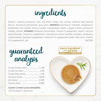 Salmon, Meat By-products, Liver, Fish Broth, Turkey, Fish, Shrimp, Artificial And Natural Flavors, Tricalcium Phosphate, Guar Gum, Minerals [Potassium Chloride, Magnesium Proteinate, Zinc Sulfate, Ferrous Sulfate, Manganese Sulfate, Copper Sulfate, Potassium Iodide], Taurine, Vitamins [Thiamine Mononitrate, Vitamin E Supplement, Niacin, Calcium Pantothenate, Vitamin A Supplement, Menadione Sodium Bisulfite Complex, Pyridoxine Hydrochloride, Riboflavin Supplement, Vitamin B-12 Supplement, Biotin, Folic Acid, Vitamin D-3 Supplement], Salt. F667320