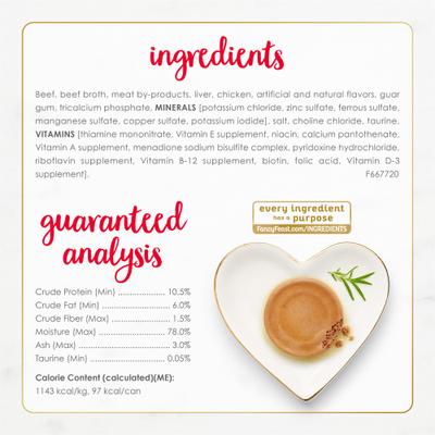 Subproductos cárnicos, caldo de res, res, pollo, sabores artificiales y naturales, goma guar, fosfato tricálcico, sal, taurina, minerales [cloruro de potasio, sulfato de magnesio, sulfato de zinc, sulfato ferroso, sulfato de cobre, sulfato de manganeso, yoduro de potasio], vitaminas [mononitrato de tiamina (vitamina B-1), suplemento de vitamina E, niacina (vitamina B-3), pantotenato de calcio (vitamina B-5), suplemento de vitamina A, complejo de bisulfito sódico de menadiona (vitamina K), clorhidrato de piridoxina (vitamina B-6), suplemento de riboflavina (vitamina B-2), suplemento de vitamina B-12, biotina (Vitamina B-7), ácido fólico (vitamina B-9), suplemento de vitamina D-3], colorante agregado, nitrito de sodio (para promover la retención del color). E-6677.