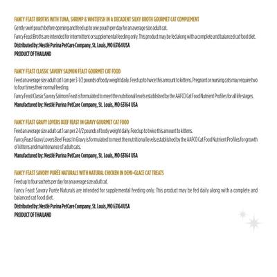 Fancy Feast Broths With Tuna, Shrimp & Whitefish In A Decadent Silky Broth Gourmet Cat Complement: Suggested daily feeding gently swirl pouch before opening and feed up to one pouch per day for an average size adult cat. Fancy feast broths are intended for intermittent or supplemental feeding only. This product may be fed along with a complete and balanced cat food diet.