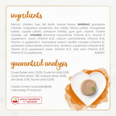 Salmon, Chicken, Liver, Fish Broth, Natural Flavors, Minerals [Potassium Chloride, Mono And Dicalcium Phosphate, Magnesium Sulfate, Zinc Sulfate, Ferrous Sulfate, Copper Sulfate, Manganese Sulfate, Potassium Iodide], Guar Gum, Taurine, Salt, Choline Chloride, Vitamins [Thiamine Mononitrate (Vitamin B-1), Vitamin E Supplement, Niacin (Vitamin B-3), Calcium Pantothenate (Vitamin B-5), Vitamin A Supplement, Menadione Sodium Bisulfite Complex (Vitamin K), Pyridoxine Hydrochloride (Vitamin B-6), Riboflavin Supplement (Vitamin B-2), Vitamin B-12 Supplement, Biotin (Vitamin B-7), Folic Acid (Vitamin B-9), Vitamin D-3 Supplement].A650918
