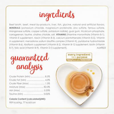 Beef Broth, Beef, Meat By-Products, Liver, Fish, Glycine, Natural And Artificial Flavors, Minerals [Potassium Chloride, Magnesium Proteinate, Zinc Sulfate, Ferrous Sulfate, Manganese Sulfate, Copper Sulfate, Potassium Iodide], Guar Gum, Tricalcium Phosphate, Carrageenan, Taurine, Choline Chloride, Salt, Vitamins [Thiamine Mononitrate (Vitamin B-1), Vitamin E Supplement, Niacin (Vitamin B-3), Calcium Pantothenate (Vitamin B-5), Vitamin A Supplement, Menadione Sodium Bisulfite Complex (Vitamin K), Pyridoxine Hydrochloride (Vitamin B-6), Riboflavin Supplement (Vitamin B-2), Vitamin B-12 Supplement, Biotin (Vitamin B-7), Folic Acid (Vitamin B-9), Vitamin D-3 Supplement]. A649823.