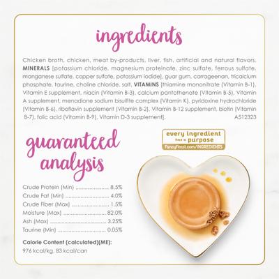 Caldo de pollo, pollo, Subproductos cárnicos, hígado, pescado, sabores artificiales y naturales, MINERALES [cloruro de potasio, proteinato de magnesio, sulfato de zinc, sulfato ferroso, sulfato de manganeso, sulfato de cobre, yoduro de potasio], goma guar, carragenina, fosfato tricálcico, taurina, cloruro de colina, sal, VITAMINAS [mononitrato de tiamina (vitamina B-1), suplemento de vitamina E, niacina (vitamina B-3), pantotenato de calcio (vitamina B-5), suplemento de vitamina A, complejo de bisulfito sódico de menadiona (vitamina K), clorhidrato de piridoxina (vitamina B-6), suplemento de riboflavina (vitamina B-2), suplemento de vitamina B-12, biotina (vitamina B-7), ácido fólico (vitamina B-9), suplemento de vitamina D-3]. A512323.