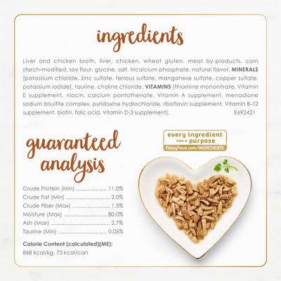 Caldo de pollo, hígado, pollo, gluten de trigo, subproductos cárnicos, almidón de maíz modificado, sabores artificiales y naturales, fosfato tricálcico, sal, concentrado de proteína de soya, minerales [cloruro de potasio, sulfato de magnesio, sulfato de zinc, sulfato ferroso, sulfato de cobre, sulfato de manganeso, yoduro de potasio], colorante añadido, taurina, cloruro de colina, vitaminas [mononitrato de tiamina (vitamina B-1), suplemento de vitamina E, niacina (vitamina B-3), pantotenato de calcio (vitamina B-5), suplemento de vitamina A, complejo de bisulfito sódico de menadiona (vitamina K), clorhidrato de piridoxina (vitamina B-6), Suplemento de riboflavina (vitamina B-2), suplemento de vitamina B-12, biotina (vitamina B-7), ácido fólico (vitamina B-9), suplemento de vitamina D-3]. D-6924