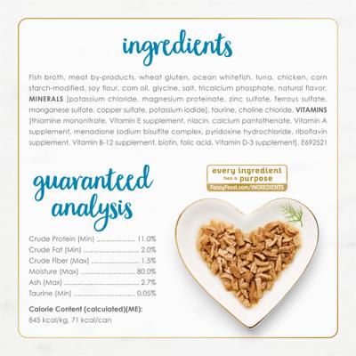 Fish Broth, Meat By-Products, Wheat Gluten, Ocean Whitefish, Tuna, Chicken, Corn Starch-Modified, Artificial And Natural Flavors, Corn Oil, Salt, Tricalcium Phosphate, Soy Protein Concentrate, Added Color, Minerals [Potassium Chloride, Magnesium Sulfate, Zinc Sulfate, Ferrous Sulfate, Copper Sulfate, Manganese Sulfate, Potassium Iodide], Taurine, Choline Chloride, Vitamins [Thiamine Mononitrate (Vitamin B-1), Vitamin E Supplement, Niacin (Vitamin B-3), Calcium Pantothenate (Vitamin B-5), Vitamin A Supplement, Menadione Sodium Bisulfite Complex (Vitamin K), Pyridoxine Hydrochloride (Vitamin B-6), Riboflavin Supplement (Vitamin B-2), Vitamin B-12 Supplement, Biotin (Vitamin B-7), Folic Acid (Vitamin B-9), Vitamin D-3 Supplement]. D-6925