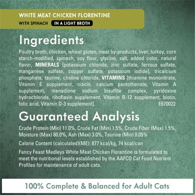 White Meat Chicken Florentine: White Meat Chicken Florentine: Poultry Broth, Chicken, Wheat Gluten, Meat By-Products, Liver, Turkey, Corn Starch-Modified, Spinach, Soy Flour, Glycine, Salt, Added Color, Natural Flavor, Minerals [Potassium Chloride, Zinc Sulfate, Ferrous Sulfate, Manganese Sulfate, Copper Sulfate, Potassium Iodide], Tricalcium Phosphate, Taurine, Choline Chloride, Vitamins [Thiamine Mononitrate, Vitamin E Supplement, Niacin, Calcium Pantothenate, Vitamin A Supplement, Menadione Sodium Bisulfite Complex, Pyridoxine Hydrochloride, Riboflavin Supplement, Vitamin B-12 Supplement, Biotin, Folic Acid, Vitamin D-3 Supplement].