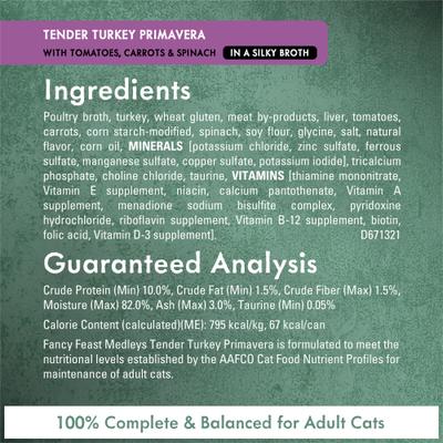 Tender Turkey Primavera: Poultry Broth, Turkey, Wheat Gluten, Meat By-Products, Liver, Tomatoes, Carrots, Corn Starch-Modified, Spinach, Soy Flour, Glycine, Salt, Natural Flavor, Corn Oil, Minerals [Potassium Chloride, Zinc Sulfate, Ferrous Sulfate, Manganese Sulfate, Copper Sulfate, Potassium Iodide], Tricalcium Phosphate, Choline Chloride, Taurine, Vitamins [Thiamine Mononitrate, Vitamin E Supplement, Niacin, Calcium Pantothenate, Vitamin A Supplement, Menadione Sodium Bisulfite Complex, Pyridoxine Hydrochloride, Riboflavin Supplement, Vitamin B-12 Supplement, Biotin, Folic Acid, Vitamin D-3 Supplement].