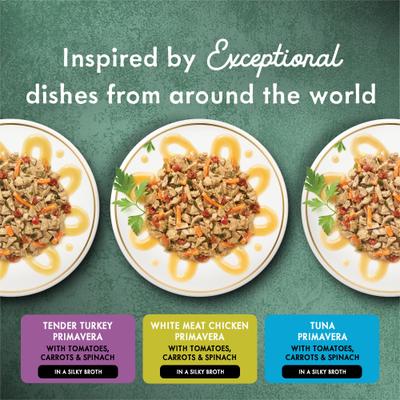 Comida húmeda gourmet para gatos Medleys Primavera Collection, paquete variado de pollo, pavo y atún en caldo, 3 oz, caja de 12
