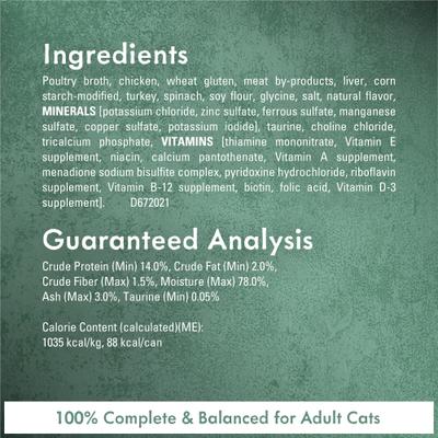 Poultry Broth, Chicken, Wheat Gluten, Meat By-Products, Liver, Corn Starch-Modified, Turkey, Spinach, Soy Flour, Glycine, Salt, Natural Flavor, MINERALS (Potassium Chloride, Zinc Sulfate, Ferrous Sulfate, Manganese Sulfate, Copper Sulfate, Potassium Iodide), Taurine, Choline Chloride, Tricalcium Phosphate, VITAMINS (Thiamine Mononitrate, Vitamin E Supplement, Niacin, Calcium Pantothenate, Vitamin A Supplement, Menadione Sodium Bisulfite Complex, Pyridoxine Hydrochloride, Riboflavin Supplement, Vitamin B-12 Supplement, Biotin, Folic Acid, Vitamin D-3 Supplement). D672021