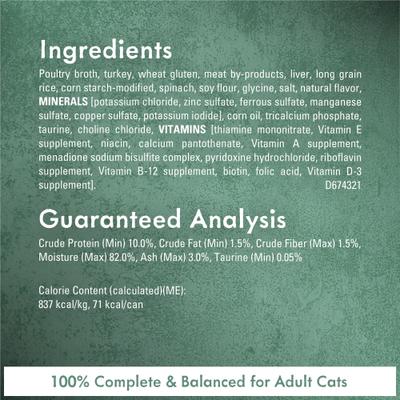Poultry Broth, Turkey, Wheat Gluten, Liver, Long Grain Rice, Meat By-Products, Spinach, Corn Starch-Modified, Artificial And Natural Flavors, Salt, Tricalcium Phosphate, Soy Protein Concentrate, Added Color, MINERALS [Potassium Chloride, Magnesium Sulfate, Zinc Sulfate, Ferrous Sulfate, Copper Sulfate, Manganese Sulfate, Potassium Iodide], Taurine, Choline Chloride, VITAMINS [Thiamine Mononitrate (Vitamin B-1), Vitamin E Supplement, Niacin (Vitamin B-3), Calcium Pantothenate (Vitamin B-5), Vitamin A Supplement, Menadione Sodium Bisulfite Complex (Vitamin K), Pyridoxine Hydrochloride (Vitamin B-6), Riboflavin Supplement (Vitamin B-2), Vitamin B-12 Supplement, Biotin (Vitamin B-7), Folic Acid (Vitamin B-9), Vitamin D-3 Supplement]. C-6743