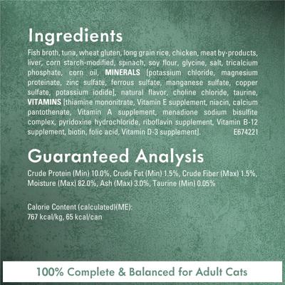 Caldo de pescado, atún, gluten de trigo, arroz de grano largo, pollo, hígado, subproductos cárnicos, espinacas, almidón de maíz modificado, sabores artificiales y naturales, sal, fosfato tricálcico, aceite de maíz, colorante añadido, concentrado de proteína de soya, MINERALES [cloruro de potasio, sulfato de magnesio, sulfato de zinc, sulfato ferroso, sulfato de cobre, sulfato de manganeso, yoduro de potasio], cloruro de colina, taurina, VITAMINAS [mononitrato de tiamina (vitamina B-1), suplemento de vitamina E, niacina (vitamina B-3), pantotenato de calcio (vitamina B-5), suplemento de vitamina A, complejo de bisulfito sódico de menadiona (vitamina K), clorhidrato de piridoxina (vitamina B-6), suplemento de riboflavina (vitamina B-2), suplemento de vitamina B-12, biotina (vitamina B-7), ácido fólico (vitamina B-9), suplemento de vitamina D-3], rojo 3. D-6742