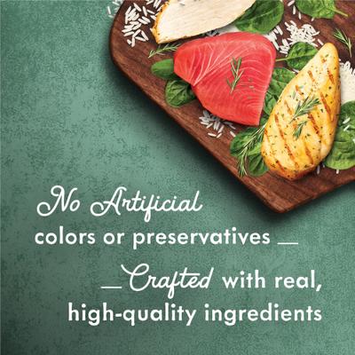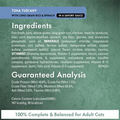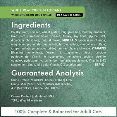 White Meat Chicken Tuscany: Poultry Broth, Chicken, Wheat Gluten, Long Grain Rice, Liver, Meat By-Products, Spinach, Corn Starch-Modified, Artificial and Natural Flavors, Turkey, Salt, Dicalcium Phosphate, Added Color, Soy Protein Concentrate, Potassium Chloride, Taurine, Choline Chloride, Magnesium Sulfate, Thiamine Mononitrate, Vitamin E Supplement, Zinc Sulfate, Ferrous Sulfate, Niacin, Calcium Pantothenate, Vitamin A Supplement, Menadione Sodium Bisulfite Complex (Source of Vitamin K Activity), Copper Sulfate, Manganese Sulfate, Pyridoxine Hydrochloride, Riboflavin Supplement, Vitamin B-12 Supplement, Biotin, Folic Acid, Vitamin D-3 Supplement, Potassium Iodide.