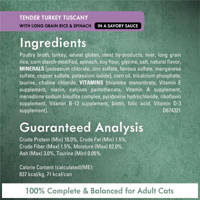 Tender Turkey Tuscany: Poultry Broth, Turkey, Wheat Gluten, Liver, Long Grain Rice, Meat By-Products, Spinach, Corn Starch-Modified, Artificial and Natural Flavors, Salt, Tricalcium Phosphate, Soy Protein Concentrate, Added Color, Potassium Chloride, Taurine, Magnesium Sulfate, Choline Chloride, Thiamine Mononitrate, Vitamin E Supplement, Zinc Sulfate, Ferrous Sulfate, Niacin, Calcium Pantothenate, Vitamin A Supplement, Copper Sulfate, Menadione Sodium Bisulfite Complex (Source of Vitamin K Activity), Manganese Sulfate, Pyridoxine Hydrochloride, Riboflavin Supplement, Vitamin B-12 Supplement, Biotin, Folic Acid, Vitamin D-3 Supplement, Potassium Iodide.