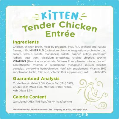 Tender Chicken Entrée Paté: Feed 1 serving per 1-1/2 pounds of body weight daily. Divide into 3 or more meals. Continue to adjust as needed to maintain your kitten in ideal body condition and avoid excess weight gain.