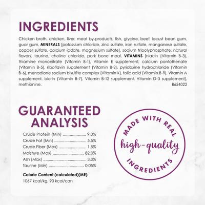Chicken Broth, Chicken, Meat By-Products, Liver, Salmon, Artificial And Natural Flavors, Beef, Pork Plasma, Steamed Bone Meal, Sodium Tripolyphosphate, Locust Bean Gum, Minerals [Potassium Chloride, Magnesium Sulfate, Zinc Sulfate, Iron Sulfate, Manganese Sulfate, Copper Sulfate, Calcium Iodate], Guar Gum, Taurine, L-Ascorbic Acid, Choline Chloride, Salt, Vitamins [Vitamin E Supplement, Niacin (Vitamin B-3), Thiamine Mononitrate (Vitamin B-1), Calcium Pantothenate (Vitamin B-5), Riboflavin Supplement (Vitamin B-2), Pyridoxine Hydrochloride (Vitamin B-6), Biotin (Vitamin B-7), Vitamin A Supplement, Vitamin B-12 Supplement, Folic Acid (Vitamin B-9), Vitamin D-3 Supplement, Menadione Sodium Bisulfite Complex (Vitamin K)]. A654018