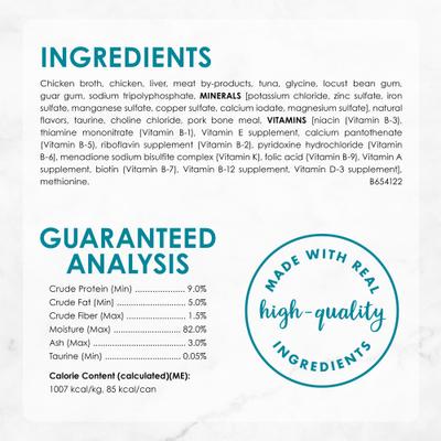 Chicken Broth, Chicken, Liver, Meat By-Products, Tuna, Artificial And Natural Flavors, Pork Plasma, Sodium Tripolyphosphate, Steamed Bone Meal, Locust Bean Gum, Minerals [Potassium Chloride, Magnesium Sulfate, Zinc Sulfate, Iron Sulfate, Manganese Sulfate, Copper Sulfate, Calcium Iodate], Guar Gum, Taurine, L-Ascorbic Acid, Choline Chloride, Vitamins [Vitamin E Supplement, Niacin (Vitamin B-3), Thiamine Mononitrate (Vitamin B-1), Calcium Pantothenate (Vitamin B-5), Riboflavin Supplement (Vitamin B-2), Pyridoxine Hydrochloride (Vitamin B-6), Biotin (Vitamin B-7), Vitamin A Supplement, Vitamin B-12 Supplement, Folic Acid (Vitamin B-9), Vitamin D-3 Supplement, Menadione Sodium Bisulfite Complex (Vitamin K)]. A654118