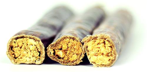 - 3-in-1 treat features beef esophagus stuffed with ground bully sticks and beef bladders.