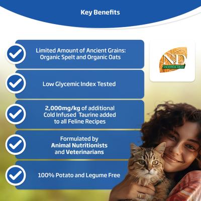 Farmina N&D Ancestral Grain Chicken & Pomegranate Neutered Cat Dry Food is the purr-fect meal for the pretty kitty with a taste for nutritious Italian fare. Comprised of a meow-trageously yummy mix of animal ingredients – including boneless chicken – GMO-free ancestral cereals, dried fruits and vegetables and essential vitamins and minerals, this delicious dish is made without corn or artificial preservatives. And because Farmina N&D Ancestral Grains products have been clinically tested through cruelty-free research to have a low glycemic index, you can be sure you’re feeding your lovely lady the diet she needs to help her stay strong. Packed in a protected environment, opened and served with love, this dry food will have your cat pricking her whiskers every time you open the bag!