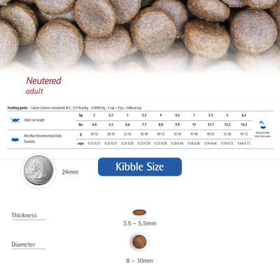- Lower-calorie formula for neutered cats, with 94% of protein derived from animal sources.