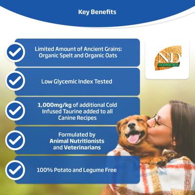 Give your peppy puppy a taste for nutritious Italian fare with Farmina N&D Ancestral Grain Lamb & Blueberry Puppy Mini Dry Dog Food. Comprised of a wag-nificently delicious mix of animal ingredients – including regionally-sourced lamb – GMO-free ancestral cereals like whole spelt and oats, and choice dried fruits like blueberries and sweet oranges, this dry food is both hearty and healthy. And because Farmina N&D Ancestral Grains products have been clinically tested through cruelty-free research to have a low glycemic index, you can be sure you’re feeding your playful pup the diet she needs to help her grow strong. Packed in a protected environment, opened and served with love, this dry food will have your youngster wagging her tail for more!