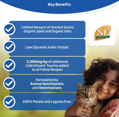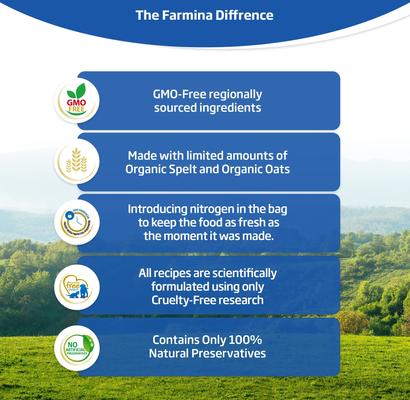 Every Farmina food is made with the best ingredients with the correct amounts of protein, fats, limited carbohydrates and advanced long life vitamins and minerals. The Natural & Delicious high protein, 20% Ancestral Grain formulas are comprised of 60% animal ingredients (pre-cooking weight), 20% organic spelt and organic oats and 20% vegetables, fruits, vitamins and minerals. These diets are also quite different from competing foods because they use better quality protein sources that are devoid of bone, so ash is as low as 6.80% and calcium and phosphorous levels are controlled.