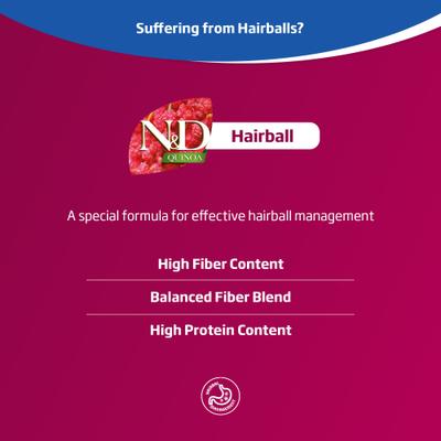 Say goodbye to pesky hairballs with Farmina N&D Quinoa Feline Duck Hairball Control Dry Cat Food. This specially formulated diet is scientifically designed to prevent hairball formation in your furbaby. With a unique blend of high-fiber ingredients, this recipe promotes the natural progression of hair through the digestive tract. Made with GMO-free duck sourced from local regions, this food is crafted in small batches using a twin-screw extruder at lower temperatures to retain essential nutrients. Plus, heat-sensitive vitamins and minerals are cold-pressed post-cooking for maximum bioavailability. And with premium natural preservatives, you can trust that this food will stay fresh.