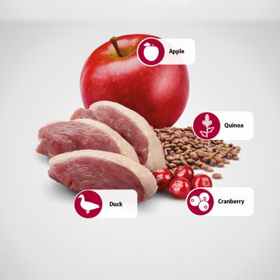 Duck, Dehydrated Duck, Pea Starch, Pea Fiber, Quinoa, Chicken Fat, Hydrolyzed Fish, Dried Eggs, Linseed, Dried Beet Pulp, Herring Oil, Dried Apple, Dried Cranberry, Psyllium Husks And Seeds, Dried Spinach, Alfalfa Meal, Fructo-Oligosaccharides, Yeast Extract (Source Of Manno-Oligo-Saccharides)), Calcium Sulphate Dihydrate, Dried Brewers' Yeast, Potassium Chloride, Sodium Chloride, Aloe Vera Extract, Glucosamine, Chondroitin Sulphate.