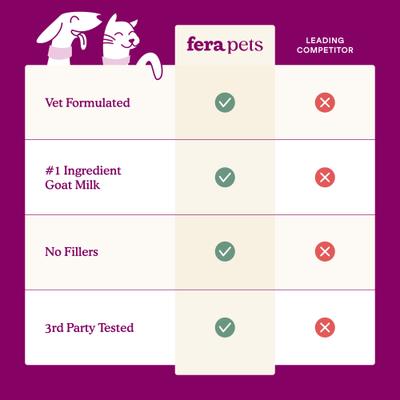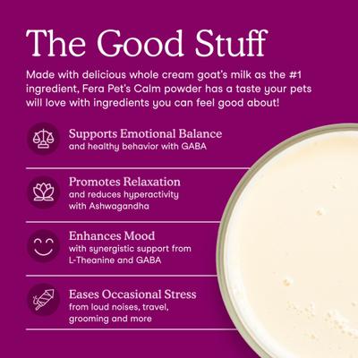 Fera Pets Calm Goat Milk Topper for Dogs & Cats helps your furry friend relax during stressful moments like fireworks, travel, or a change in routine. The gentle, goat milk-based powder is blended with calming ingredients including ashwagandha KSM-66, GABA, and L-theanine. Together, they promote relaxation, emotional balance, and a calmer mood—without the use of sedatives or fillers. Plus, goat milk is tasty and easy to digest, making it a great choice for picky eaters.