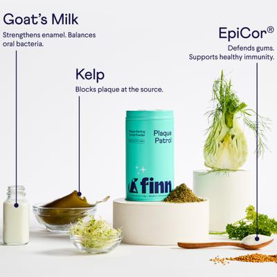 Say goodbye to doggy breath and hello to a healthier mouth with Finn Plaque Patrol Dental Powder. This vet-formulated powder is designed to protect your pup's pearly whites with every bite. It goes beyond surface cleaning and targets the root of oral health issues, such as plaque, tartar, bad breath, and gum health. Made with a powerful blend of kelp, EpiCor, and bee propolis, this powder breaks down stubborn buildup, strengthens gums, and supports a balanced oral microbiome. Plus, parsley and fennel seed work together to neutralize odor-causing bacteria, keeping your pup's breath fresh straight from the source. Simply sprinkle Plaque Patrol over your pup's meal for fresher breath, healthier gums, and stronger teeth every day.