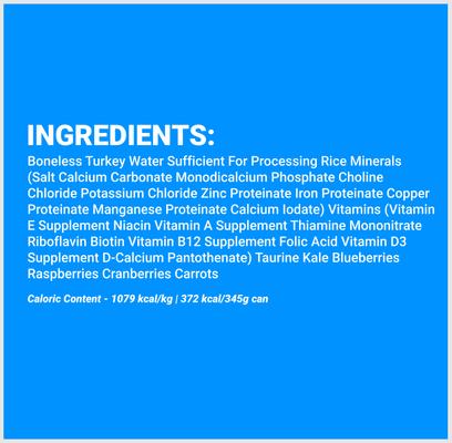 Boneless Turkey Water Sufficient For Processing Rice Minerals (Salt Calcium Carbonate Monodicalcium Phosphate Choline Chloride Potassium Chloride Zinc Proteinate Iron Proteinate Copper Proteinate Manganese Proteinate Calcium Iodate) Vitamins (Vitamin E Supplement Niacin Vitamin A Supplement Thiamine Mononitrate Riboflavin Biotin Vitamin B12 Supplement Folic Acid Vitamin D3 Supplement D-Calcium Pantothenate) Taurine Kale Blueberries Raspberries Cranberries Carrots