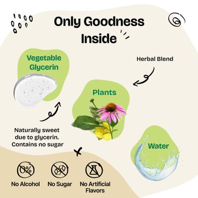 - Made with herbal ingredients, purified water, and glycerin, this supplement contains no sugar, alcohol, preservatives, artificial colors, or animal-derived ingredients.