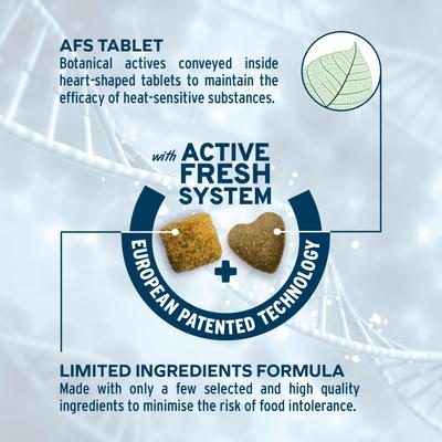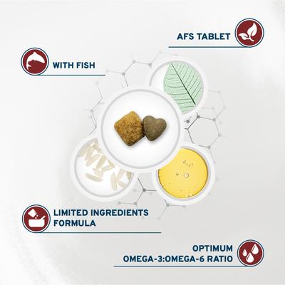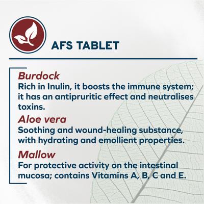 Milled rice, dehydrated fish, rice middlings, potato starch, ((AFS tablet – 7% of the food): potato protein, hydrolyzed fish protein, anchovy oil, products from the processing of vegetables (powdered Aloe vera gel, Mallow), products and co-products from the processing of fresh fruits and vegetables (blackberry)), beet pulp, fish oil, potato protein, sunflower oil, dried algae (Ascophyllum nodosum), hydrolyzed poultry protein, mannan oligosaccharides (MOS), fructo-oligosaccharides (FOS), Yucca schidigera, vitamin A, vitamin E, vitamin B1, vitamin B2, vitamin B6, vitamin C, vitamin B12, vitamin PP, calcium D-pantothenate, folic acid, choline chloride, DL-methionine, zinc sulphate monohydrate, copper(II) chelate of amino acids hydrate, clinoptilolite of sedimentary origin, tocopherol extract from vegetable oils, Burdock (Arctium lappa), Rosemary.