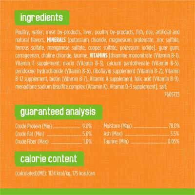 Poultry, Water, Meat By-Products, Liver, Poultry By-Products, Fish, Rice, Artificial And Natural Flavors, MINERALS [Potassium Chloride, Magnesium Proteinate, Zinc Sulfate, Ferrous Sulfate, Manganese Sulfate, Copper Sulfate, Potassium Iodide], Guar Gum, Carrageenan, Choline Chloride, Taurine, VITAMINS [Thiamine Mononitrate (Vitamin B-1), Vitamin E Supplement, Niacin (Vitamin B-3), Calcium Pantothenate (Vitamin B-5), Pyridoxine Hydrochloride (Vitamin B-6), Riboflavin Supplement (Vitamin B-2), Vitamin B-12 Supplement, Biotin (Vitamin B-7), Vitamin A Supplement, Folic Acid (Vitamin B-9), Menadione Sodium Bisulfite Complex (Vitamin K), Vitamin D-3 Supplement], Salt. F605723