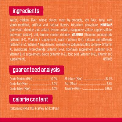 Water, Chicken, Liver, Wheat Gluten, Meat By-Products, Soy Flour, Tuna, Corn Starch-Modified, Artificial And Natural Flavors, Tricalcium Phosphate, MINERALS [Potassium Chloride, Zinc Sulfate, Ferrous Sulfate, Manganese Sulfate, Copper Sulfate, Potassium Iodide], Salt, Taurine, Choline Chloride, VITAMINS [Thiamine Mononitrate (Vitamin B-1), Vitamin E Supplement, Niacin (Vitamin B-3), Calcium Pantothenate (Vitamin B-5), Vitamin A Supplement, Menadione Sodium Bisulfite Complex (Vitamin K), Pyridoxine Hydrochloride (Vitamin B-6), Riboflavin Supplement (Vitamin B-2), Vitamin B-12 Supplement, Biotin (Vitamin B-7), Folic Acid (Vitamin B-9), Vitamin D-3 Supplement]. H611023