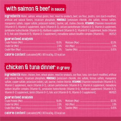 Chicken & Tuna Dinner In Gravy: Water, Wheat Gluten, Chicken, Liver, Meat By-Products, Ocean Whitefish, Soy Flour, Tuna, Corn Starch-Modified, Artificial And Natural Flavors, Tricalcium Phosphate, MINERALS [Potassium Chloride, Magnesium Proteinate, Zinc Sulfate, Ferrous Sulfate, Manganese Sulfate, Copper Sulfate, Potassium Iodide], Taurine, Choline Chloride, Salt, VITAMINS [Thiamine Mononitrate (Vitamin B-1), Vitamin E Supplement, Niacin (Vitamin B-3), Calcium Pantothenate (Vitamin B-5), Vitamin A Supplement, Menadione Sodium Bisulfite Complex (Vitamin K), Pyridoxine Hydrochloride (Vitamin B-6), Riboflavin Supplement (Vitamin B-2), Vitamin B-12 Supplement, Biotin (Vitamin B-7), Folic Acid (Vitamin B-9), Vitamin D-3 Supplement.