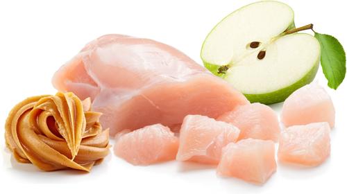 Chicken, Apple, Tapioca Flour, Canola Oil, Peanut Butter, Cane Molasses, Vegetable Glycerin, Salt, Citrus Fiber, Mixed Tocopherols (Preservative), Organic Apple Cider Vinegar, Citric Acid (Preservative), Rosemary Extract.