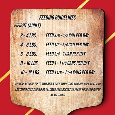 Adult: feed an average size adult cat 1 can per 8 lbs of body weight daily.Kitten: feed up to two-and-a-half times the adult amount per day. Gestation and lactation: allow free access to food. Notes: adjust the amount of food you serve based on the age, size, and activity level of your cat. Food should be fed at room temperature. Fresh water should be available at all times.