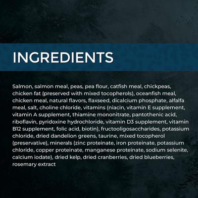 Salmon, Salmon Meal, Peas, Pea Flour, Chickpeas, Chicken Fat (Preserved with Mixed Tocopherols and Citric Acid), Catfish Meal, Natural Flavors, Whitefish Meal, Flax Seeds, Chicken Meal, Alfalfa Meal, Calcium Carbonate, Kelp Meal, Choline Chloride, Salt, Fructooligosaccharide, Minerals (Iron Proteinate, Zinc Proteinate, Copper Proteinate, Manganese Proteinate, Cobalt Proteinate), Potassium Chloride, Taurine, Dl Methionine, Blueberries, Cranberries, Vitamins (Vitamin A Acetate, Vitamin D3 Supplement, Vitamin E Supplement, Niacin, D-Calcium Pantothenate, Thiamine Mononitrate, Riboflavin Supplement, Pyridoxine Hydrochloride, Folic Acid, Biotin, Vitamin B12 Supplement), Lactic Acid, Calcium Iodate, Sodium Selenite, Rosemary Extract.