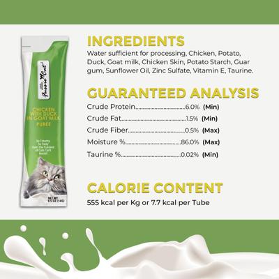 - Este premio para gatos contiene pollo jugoso y pato en una salsa cremosa de leche de cabra para un sabor realmente exquisito.