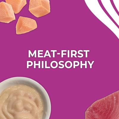 Agua suficiente para el procesamiento, atún, salmón, patata, calabaza, aceite de girasol, goma xantana, taurina, suplemento de vitamina E, anchoas, Pollo, pato, hígado de pollo.