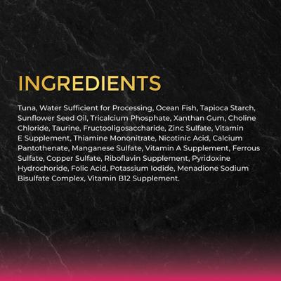 Tuna, water sufficient for processing, Oceanfish, Tapioca Starch, Sunflower Seed Oil, Tricalcium Phosphate, Xanthan Gum, Choline Chloride, Taurine, Frustooligosaccharide, Zinc Sulfate, Vitamin E Supplement, Thiamine Mononitrate, Nicotinic Acid, Calcium Pantothenate, Manganese Sulfate, Vitamin A Supplement, Ferrous Sulfate, Copper Sulfate, Riboflavin Supplement, Pyridoxine Hydrochoride, Folic Acid, Potassium Iodide, Menadione Sodium Bisulfate Complex, Vitamin B12 Supplement