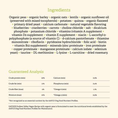 Feed your paw-tner a new kind of healthy, plant-based food—Gather Endless Valley Vegan Dry Dog Food! This recipe is a great option for dogs who are sensitive to animal proteins and thrive on a plant-based diet. It’s crafted with carefully selected certified organic ingredients and has a perfect blend of 100% plant-based protein from certified organic peas and other natural ingredients. Carefully balanced by expert pet nutritionists, this recipe provides wholesome and natural nutrition with the wag-worthy taste dogs love. The ingredients are sourced from some of the best ingredient suppliers in the world who proactive responsible, sustainable production of extraordinary quality, certified, and organic ingredients. This recipe delivers whole food from the earth with nothing added that’s not needed.