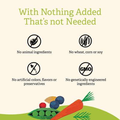 - Made by expert pet nutritionists with certified organic peas for protein and flaxseed and sunflower oil, which contain omega-3 and -6 fatty acids for skin and coat health. There are no GMOs, or artificial colors, flavor or preservatives in here!