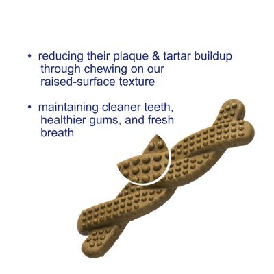 - Reduces plaque and tartar as your pup chews with a twisted and textured shape and multi-level surface.