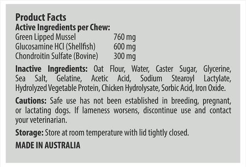 Active Ingredients: Green Lipped Mussel, Glucosamine HCl (Shellfish), Chondroitin Sulfate (Bovine).