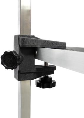 - Install clamps, arm and strap securely to side of table and turn screws until tight.