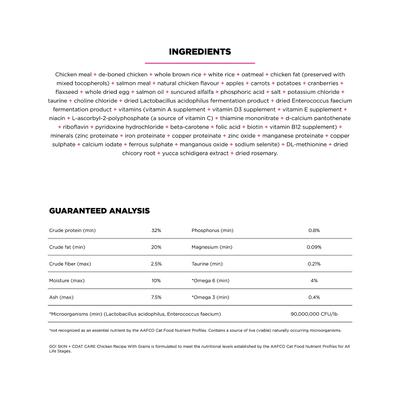 Chicken Meal, De-Boned Chicken, Whole Brown Rice, White Rice, Oatmeal, Chicken Fat (Preserved With Mixed Tocopherols), Salmon Meal, Natural Chicken Flavor, Apples, Carrots, Potatoes, Cranberries, Flaxseed, Whole Dried Egg, Salmon Oil, Alfalfa, Phosphoric Acid, Sodium Chloride, Potassium Chloride, Taurine, Choline Chloride, Vitamins (Vitamin A Supplement, Vitamin D3 Supplement, Vitamin E Supplement, Niacin, L-Ascorbyl-2-Polyphosphate (A Source Of Vitamin C), Thiamine Mononitrate, D-Calcium Pantothenate, Riboflavin, Pyridoxine Hydrochloride, Beta-Carotene, Folic Acid, Biotin, Vitamin B12 Supplement), Minerals (Zinc Proteinate, Iron Proteinate, Copper Proteinate, Zinc Oxide, Manganese Proteinate, Copper Sulphate, Calcium Iodate, Ferrous Sulphate, Manganous Oxide, Sodium Selenite), Dl-Methionine, Dried Chicory Root, Yucca Schidigera Extract, Dried Rosemary.