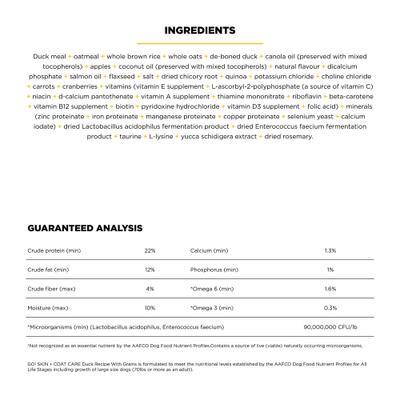 Duck meal, oatmeal, whole brown rice, whole oats, de-boned duck, canola oil (preserved with mixed tocopherols), apples, coconut oil (preserved with mixed tocopherols), natural flavor, dicalcium phosphate, salmon oil, flaxseed, salt, dried chicory root, quinoa, potassium chloride, choline chloride, carrots, cranberries, vitamins (vitamin E supplement, L-ascorbyl-2-polyphosphate (a source of vitamin C), niacin, d-calcium pantothenate, vitamin A supplement, thiamine mononitrate, riboflavin, beta-carotene, vitamin B12 supplement, biotin, pyridoxine hydrochloride, vitamin D3 supplement, folic acid), minerals (zinc proteinate, iron proteinate, manganese proteinate, copper proteinate, selenium yeast, calcium iodate), dried Lactobacillus acidophilus fermentation product, dried Enterococcus faecium fermentation product, taurine, L-lysine, yucca schidigera extract, dried rosemary.
