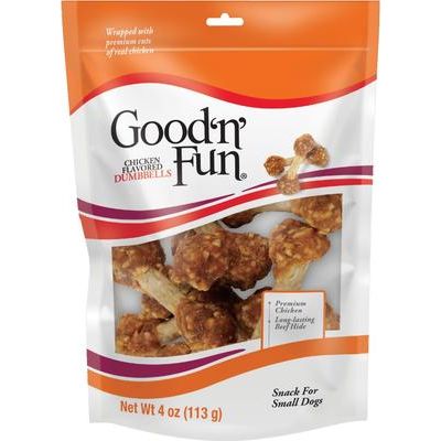 Dale a tu perro una Good ‘n’ Fun Chicken Flavored Dumbbell al día. Solo para consumo supervisado. Seleccione un masticable ligeramente más grande que el tamaño de la boca de su mascota. Deseche los trozos o fragmentos. Proporcione siempre abundante agua fresca para beber y visite a su veterinario regularmente.