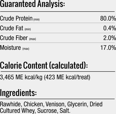 Rawhide, Chicken, Venison, Glycerin, Dried Cultured Whey, Sucrose, Salt.